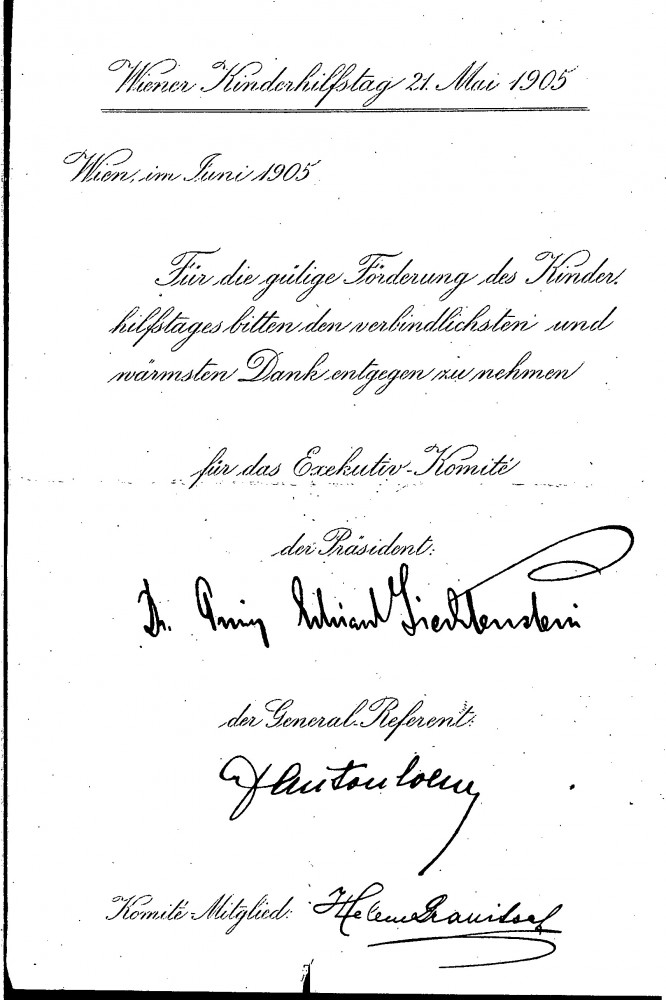 Letter thanking de László for generously supporting Vienna Children's Aid Day, 1905