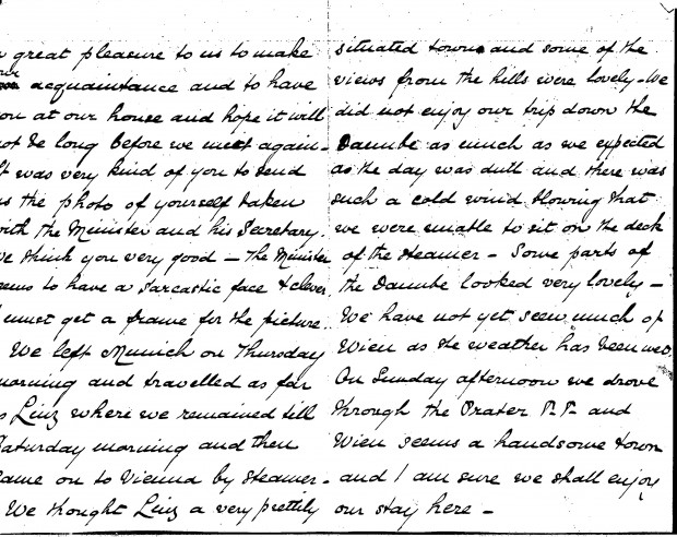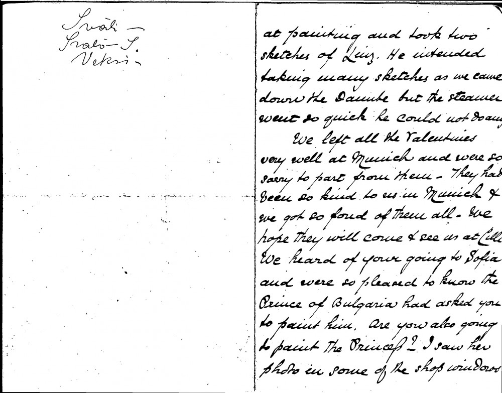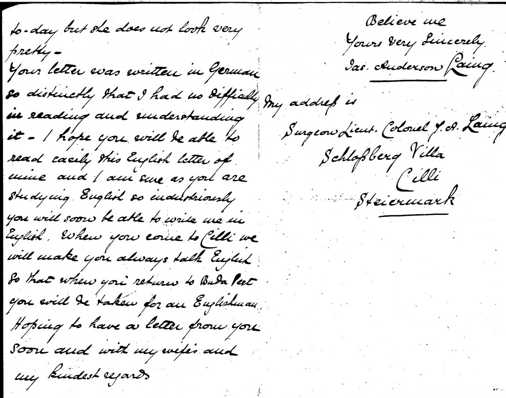 Approximate date given. Partial letter from Surgeon Lieutenant Colonel James Anderson Laing to de László in which he thanks the artist for the photograph of "yourself... with the Minister and his Secretary"; he writes of a trip down the Danube and of his impressions of Vienna; he has heard that de László is going to Sofia to paint royalty there [3937] [3715]; he finishes the letter by praising the artist's industriousness in studying English. He probably met the artist through the Valentin family, with whom he lived while studying in Munich, and who are mentioned in letter