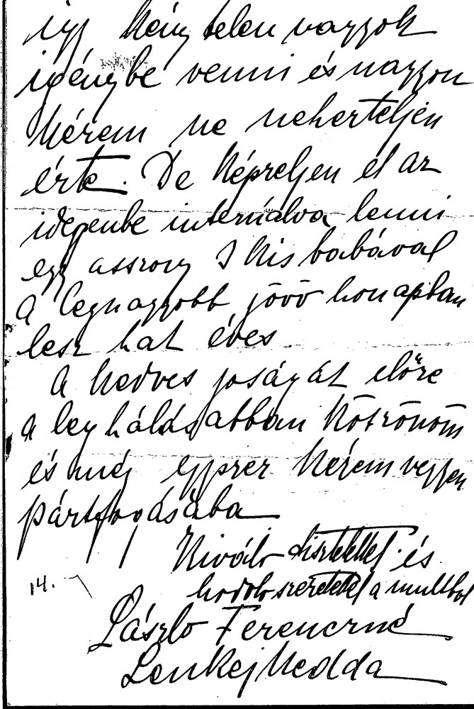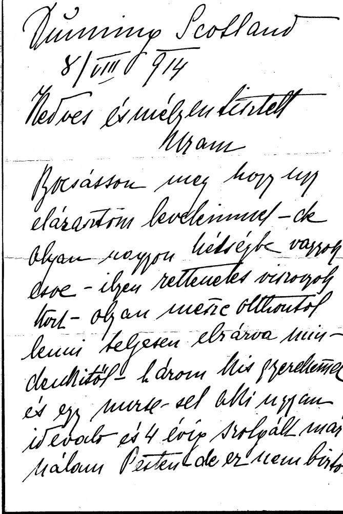 Letter from Mrs Ferencz László, née Nedda Lenkey (formerly an actress at the National Theatre in Budapest) asking for de László's help. She wants him to intervene on her behalf with the Hungarian Embassy or through his connections to contact István Bárczy, the Mayor of Budapest, to help her to get funds from Hungary. She has become stuck in Scotland at the outbreak of the war and is terrified, in the atmosphere of spy mania, of being interned as an enemy alien with her six year old son
