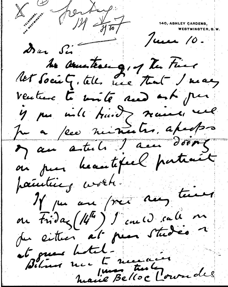 Letter from the novelist Marie Belloc Lowndes in which she requests a meeting with de László as she is writing an article about his "beautiful portrait painting work"