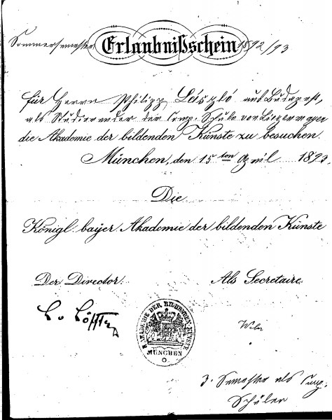 Permit dated 15th April 1893 for de László to visit the Academy of Fine Arts Munich as a student under the "School of Liezen-Mayer"
