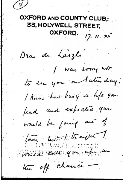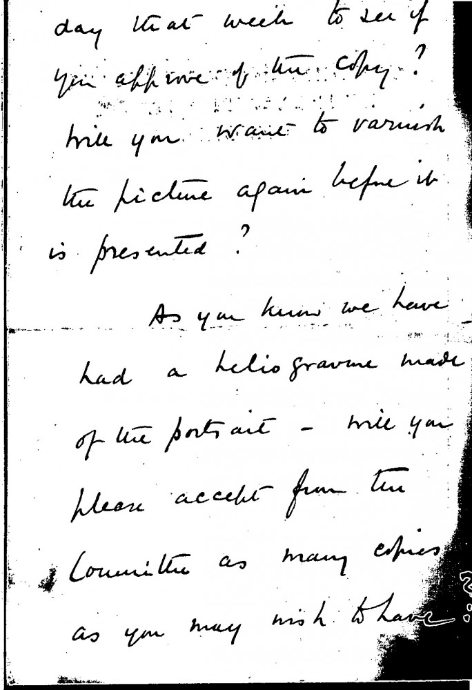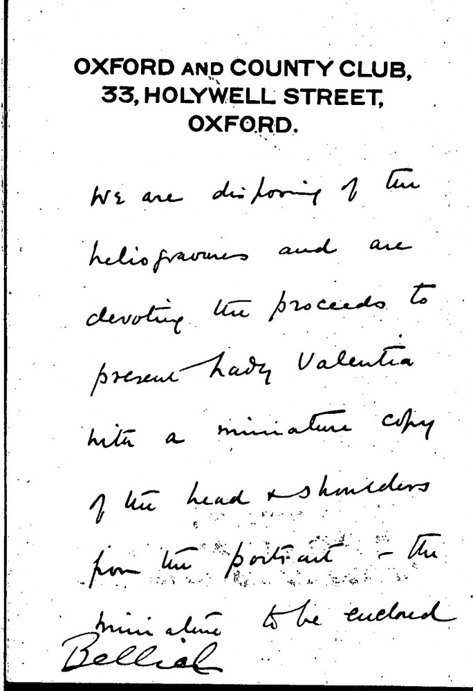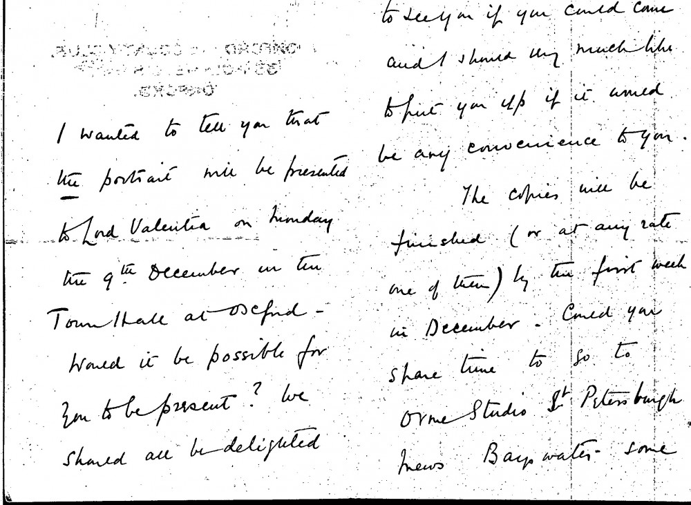 Letter from Major Lee to de László regarding the artist's portrait of Lord Valentia [7395]. Invites de László to the official presentation and asks him to approve Frederick Cullen's copies after the portrait. Also mentions varnishing, heliogravures and the miniature copy of the portrait to be presented to Lady Valentia (DLA009-0025 and DLA009-0026 were previously partial items that have now been merged into DLA009-0025. DLA009-0026 has been deleted, AD 04/03/21)