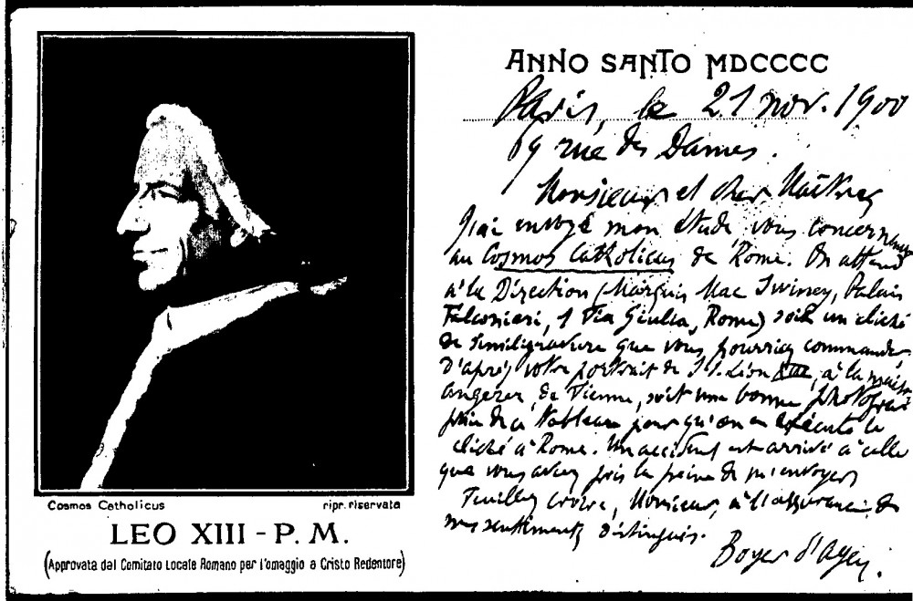 Letter requesting a negative or engraving of de László's portrait of Pope Leo XIII [4509] for publication in Cosmos Catholicus