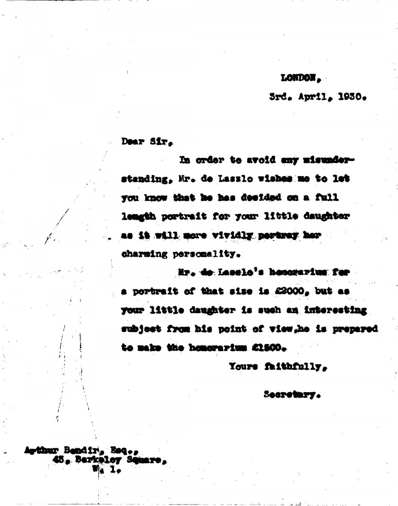 De László has decided to paint a full-length portrait of Bendir's daughter Jane [6859] for the reduced fee of £1500.