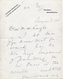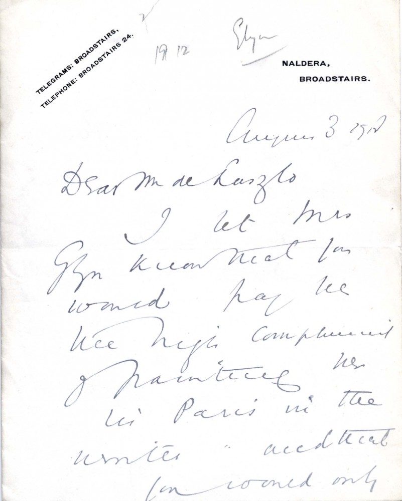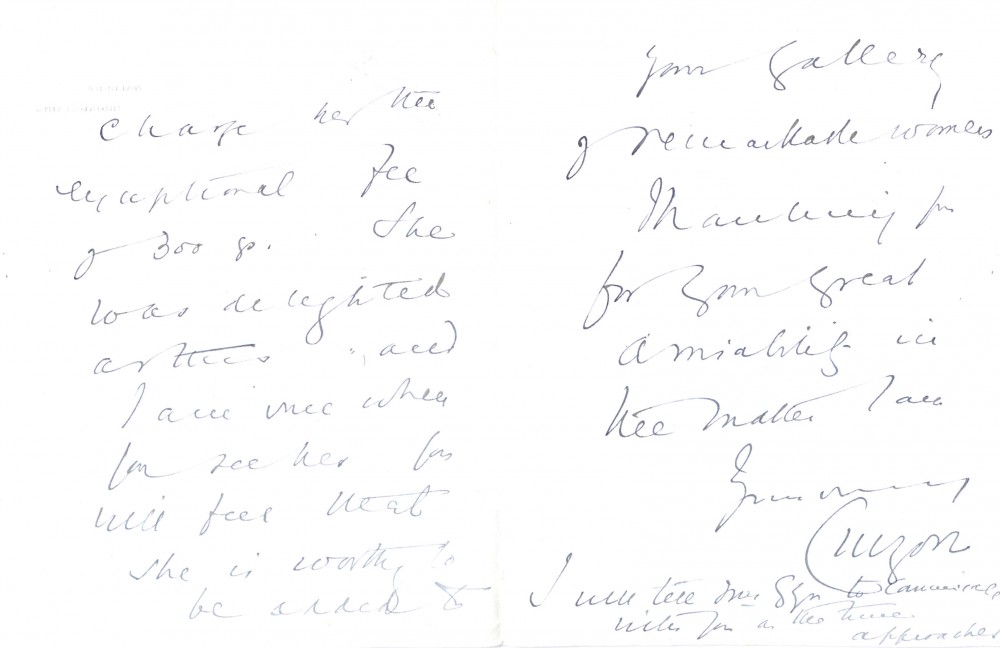 Letter from Lord Curzon to de László expressing Elinor Glyn's delight at de László's offer to paint her [5361] for the "exceptional fee of 300 gs" (see fn 1 in transcription re item's date) (DLA123-0099 is a duplicate of this item)