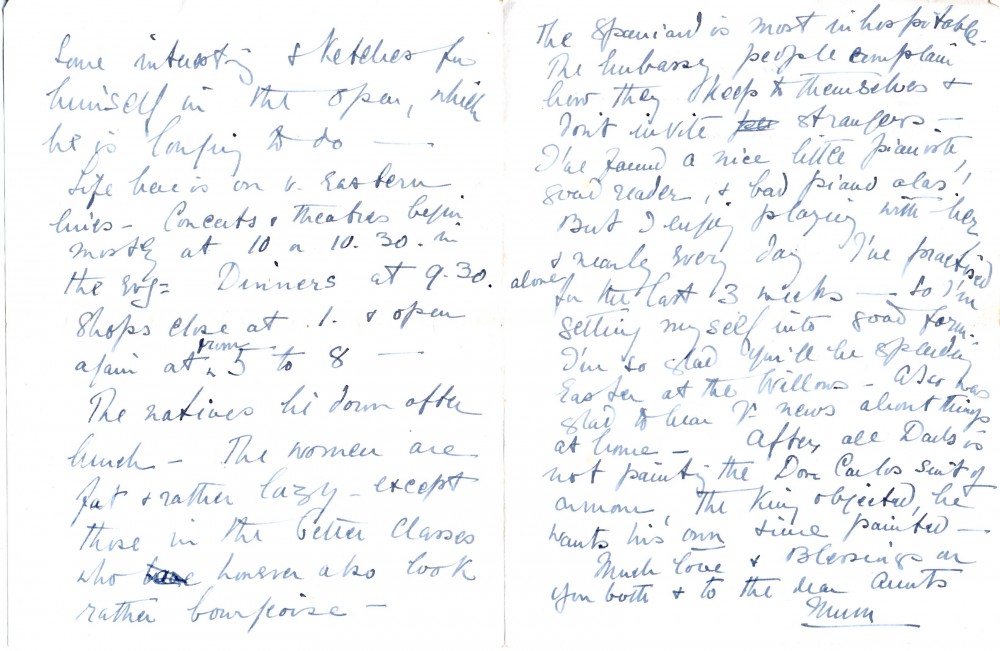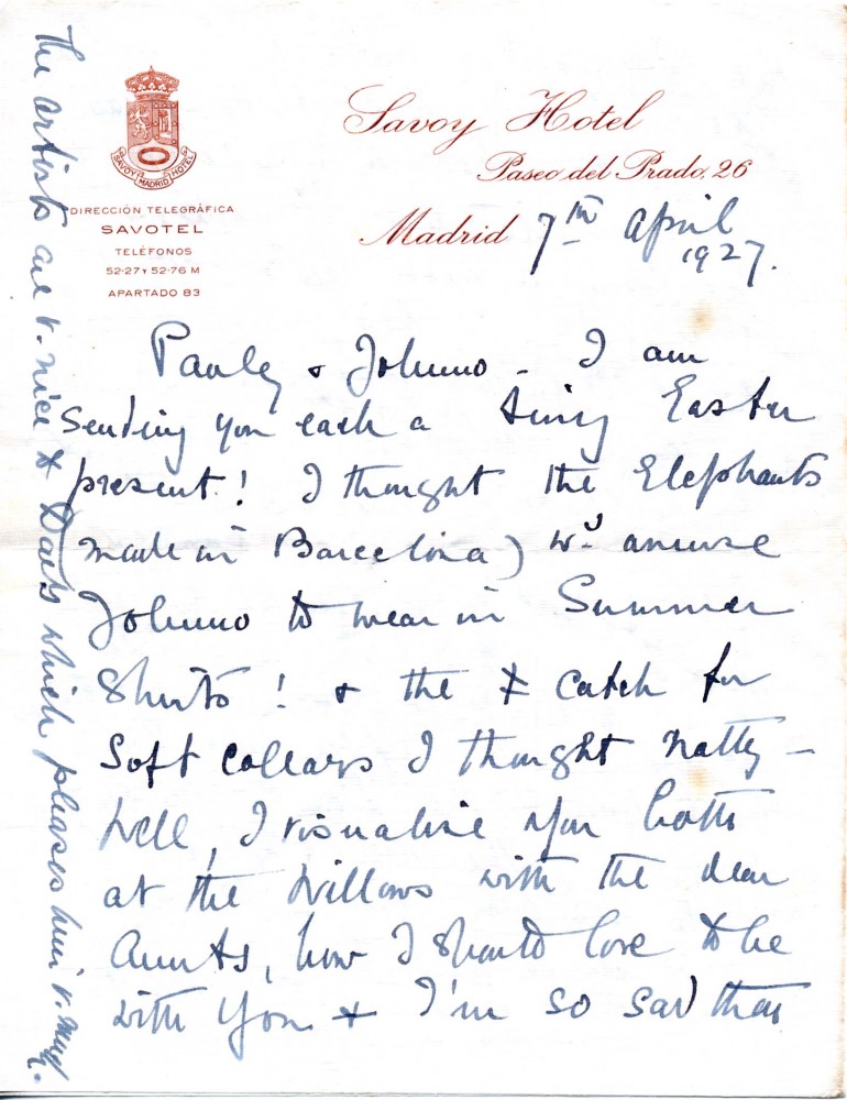 Letter from Lucy de László to her sons Paul and John from Spain. Court is leaving suddenly–de László must finish work; he longs to do outdoor sketching. Lucy complains about the Spanish. King objected to Don Carlo armour for portrait; artists are very nice to de László