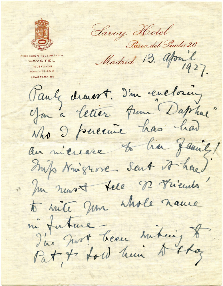 Letter from Lucy de László to her son Paul from Spain; encloses letter from "Daphne". She and de László stuck in Spain. De László intends to do some sketching. Passage on King's personality comparing him to duc de Gramont and Charles V