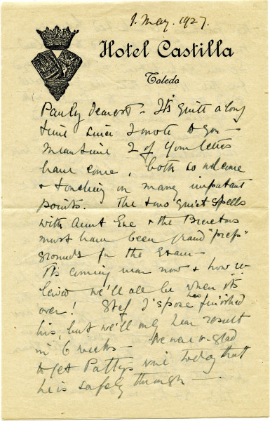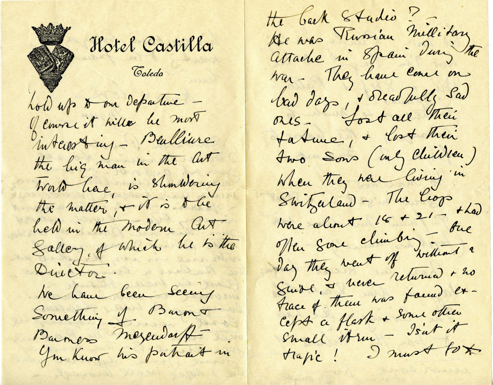 Letter from Lucy & de László to their son Paul from Spain. "These are great historic days in dear Dads life I’m living ... He has to pay the tribute of his greatness, everyone wanting to be painted by him!" De László does not want to see Henry (see fn 6 in transcription). Madrid exhibition. Reference to the Meyendorffs. De László says his time in Spain "will account in my life" & that the Prince of Wales & Prince George spent time in his studio at the Palace