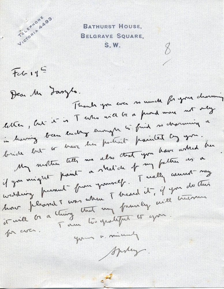 Lord Apsley will be proud to have a portrait of his fiancée by de László [3534], and is so pleased that the artist has offered to do a sketch of his father as a wedding present [3541]