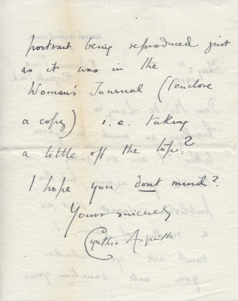 Letter from Lady Asquith to de László asking if he will allow his portrait to be reproduced as it was for the "Woman's Journal" (i.e. cropped at the top)