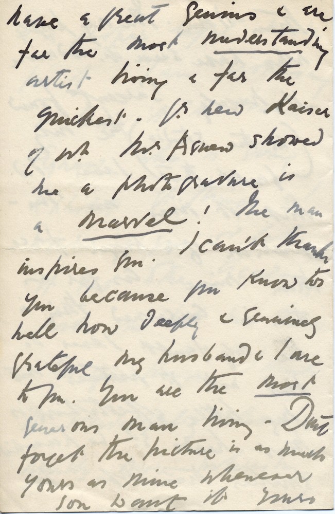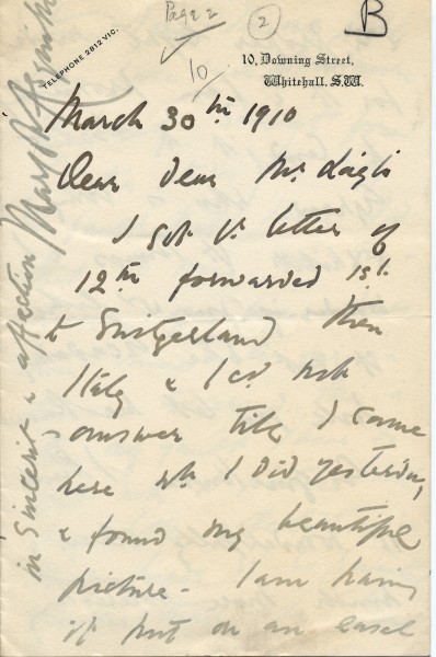 Margaret Asquith has received her picture [9769]; promised it to Lockett Agnew for exhibition. Does de László want to send it to Academy? Aesthetics of portrait, particularly face, which Sargent said too large. Has seen his new Kaiser, a "marvel". De László is a "genius" & "the most generous man living"