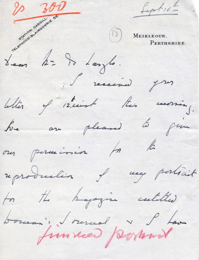 Letter from Lady Violet Astor to de László allowing her portrait [likely 2445] to be reproduced in the "Woman's Journal" (letter dated 16 Sept., possibly 1927, see fn 1 in transcription)