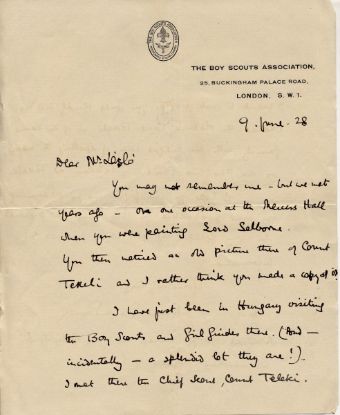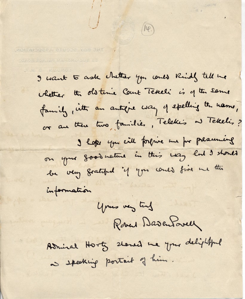 Robert Baden-Powell asks de László whether Count Pál Teleki is of the same family as Count Tekeli (the latter's portrait hangs in the Mercers' Hall). Admiral Horthy showed him (Baden-Powell) de László's "delightful and speaking portrait" [5684]