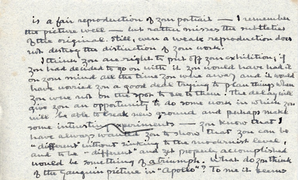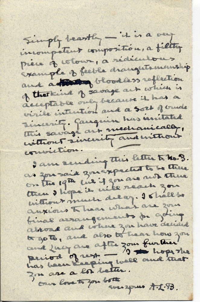 Letter from Alfred Baldry to de László discussing the artist's health & departure for France; reproduction of [2203] in "Scots Magazine"; postponement of exhibition, which will give de László time to "experiment". Asks views on Gauguin picture in the "Apollo", which Baldry lambasts
