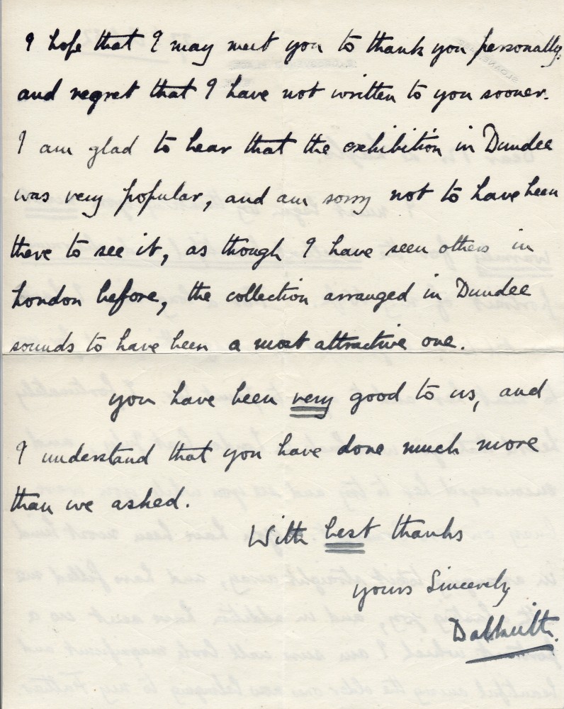 Lord Dalkeith thanks de László for the "excellent beautiful and charming" portrait of his wife [3733]; was sorry to have missed the Dundee exhibition