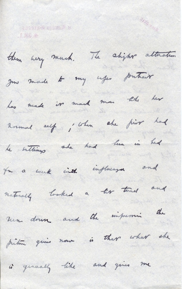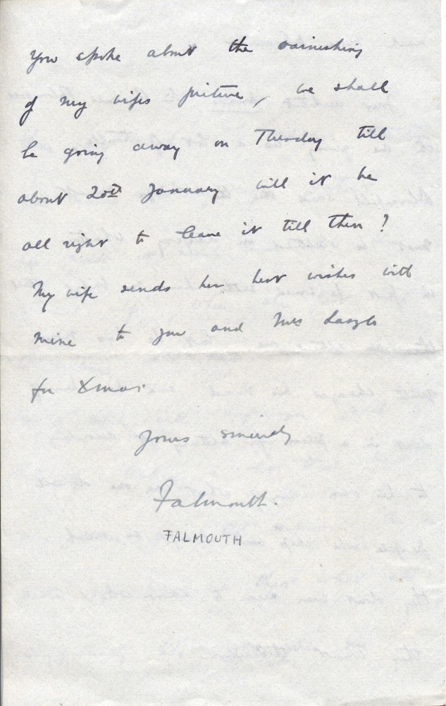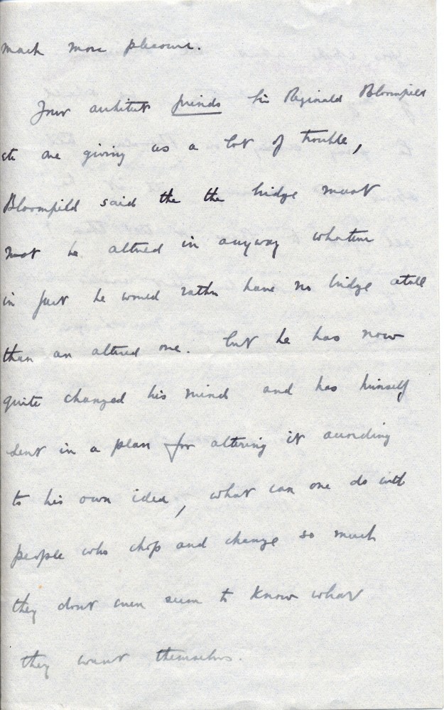 Lord Falmouth is delighted with new location of pictures [111881] & [likely 5051] and de László's alterations to wife's portrait; varnishing [111881]. Problems with Reginald Bloomfield–a friend of de László–and alterations to a bridge [this is a duplicate item, see DLA123-0015]