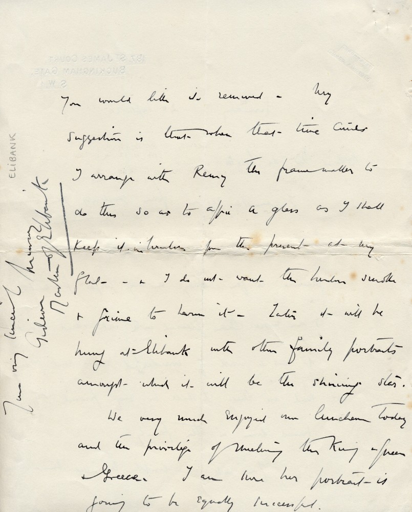 Lord Elibank thanks de László for wife's portrait [5010], "a work of wonderful art and beauty". Will arrange glazing with Remy; portrait will later be hung at Elibank. Mentions lunch with King & Queen of Greece, is sure the latter's portrait [3270] will be successful