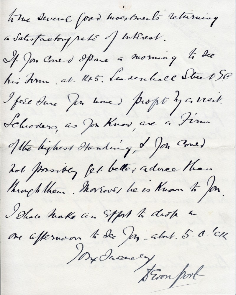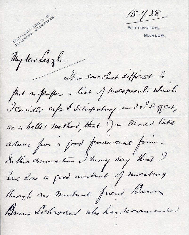 Lord Devonport recommends Baron Bruno Schröder's firm to de László for his financial investments