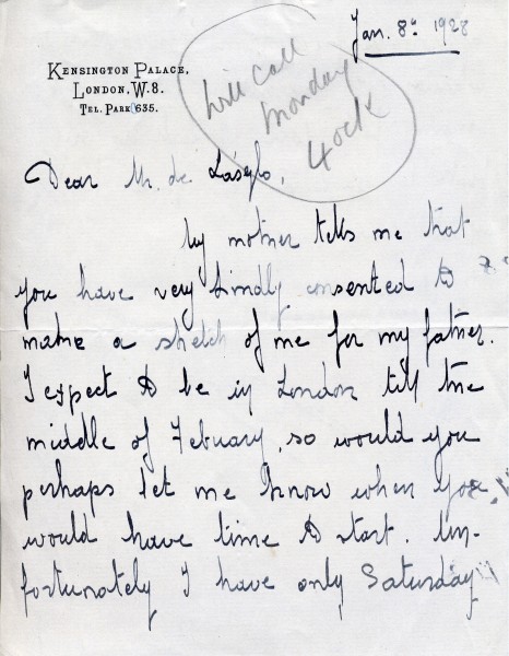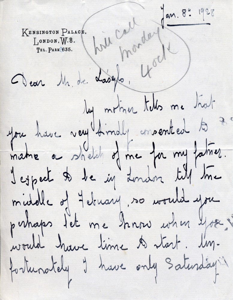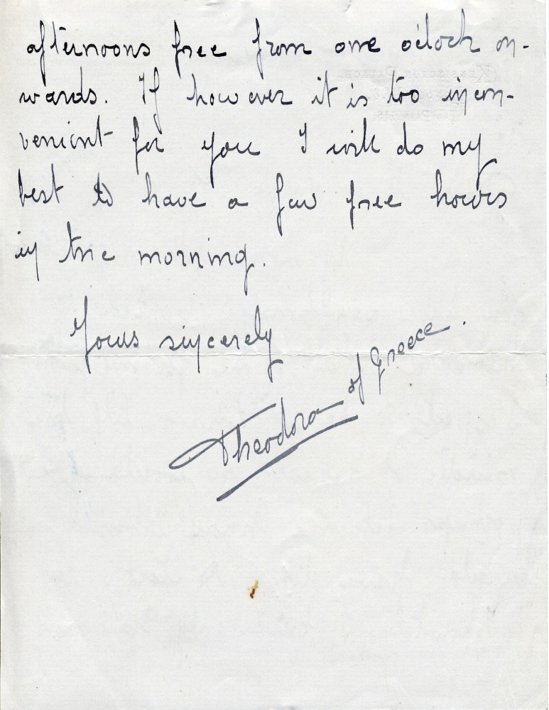 Letter from Princess Theodora of Greece to de László arranging sittings for her portrait sketch [7851]