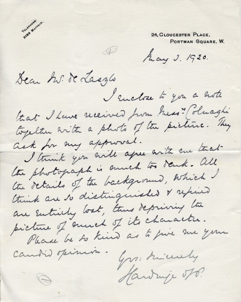 Letter from Lord Hardinge to de László enclosing a note from Colnaghi with a photograph of the picture [possibly 111008]; thinks too dark, asks de László's opinion