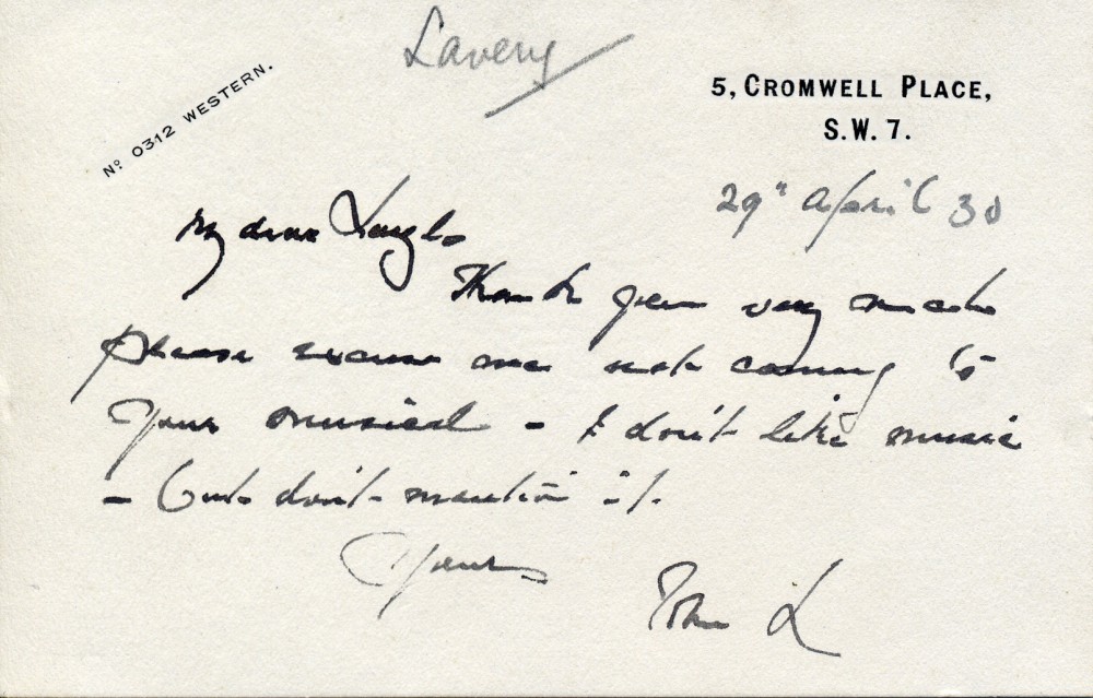 Sir John Lavery declines an invitation to de László's musical. "I don't like music", he writes, "but don't mention it"