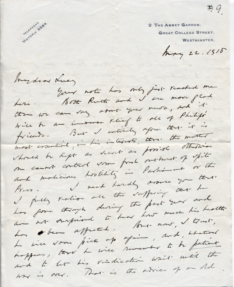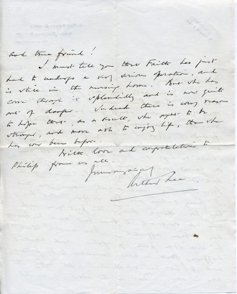 Letter from Lord Lee to Lucy regarding de László's internment; delighted by the good news (possibly the artist's move from an internment camp to a nursing home), but advises that vindication should wait until war is over. Mentions Faith's successful operation