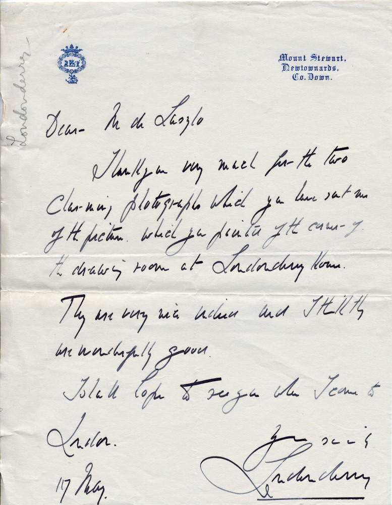 Letter from Lord Londonderry to de László thanking him for photographs of the picture [6136] (dated 17 May, no year)