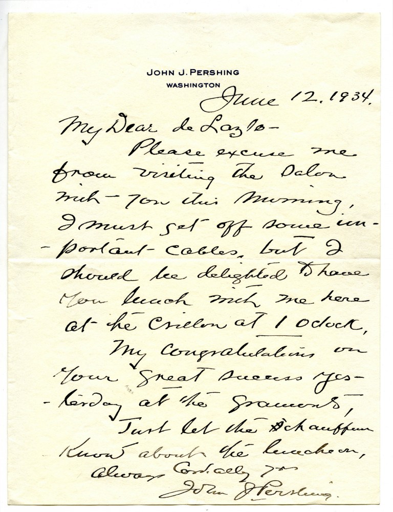 General Pershing excuses himself from going to the Salon; invites de László to lunch instead. Congratulates de László on his great success at the Gramonts (see fn 2 in transcription)