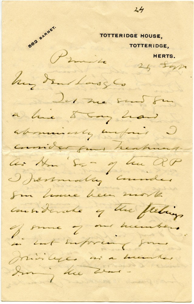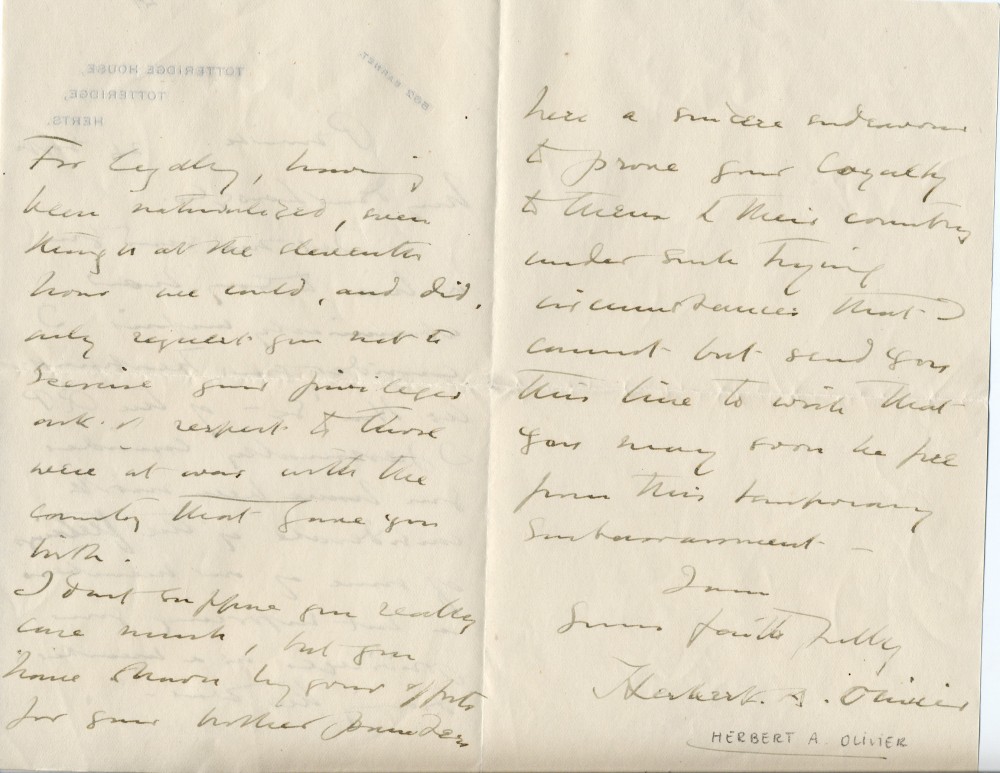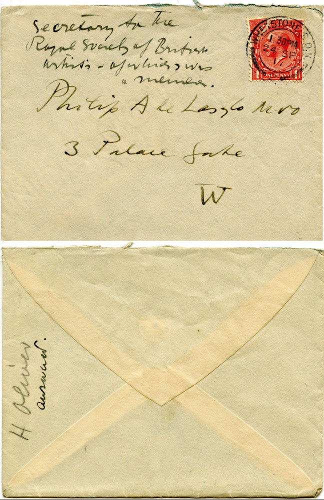 Letter from Herbert Arnould Olivier concerning the unfair treatment de László is receiving during wartime; de László has been most considerate in not exercising member privileges of the Royal Society of Portrait Painters