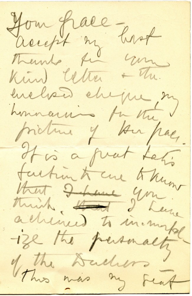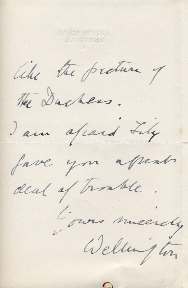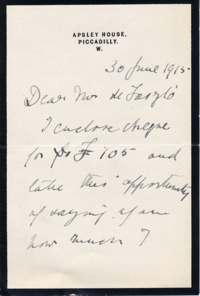 Item contains letter and draft reply. Letter from 4th Duke of Wellington to de László enclosing cheque for wife's portrait [5765]; likes it; sorry Lily gave de László "a great deal of trouble". Draft reply from de László thanking Duke; satisfied to know successfully immortalised Duchess' personality