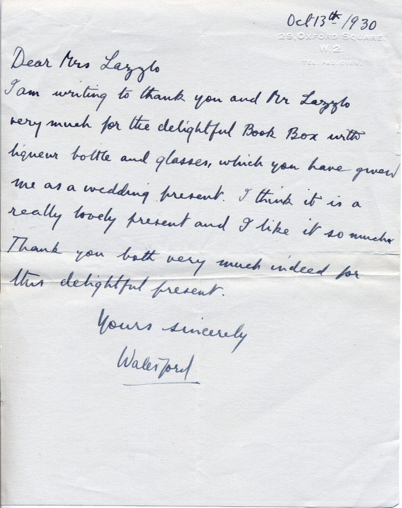 Letter from Lord Waterford thanking Lucy and de László for the wedding present
