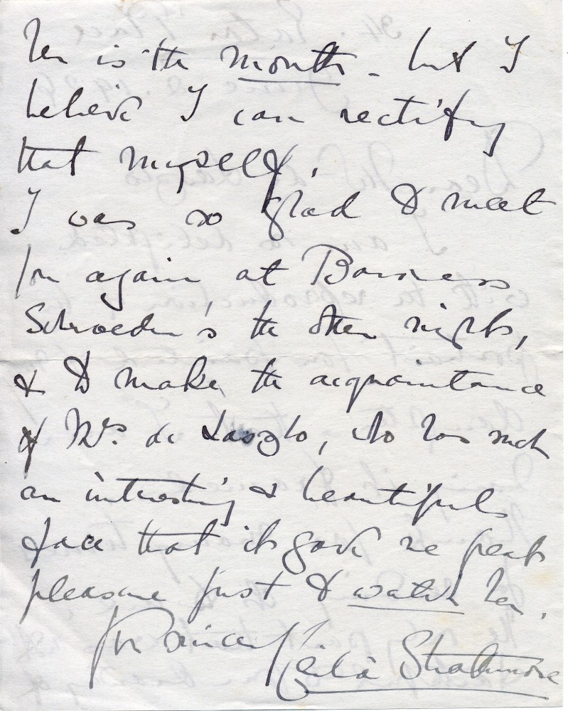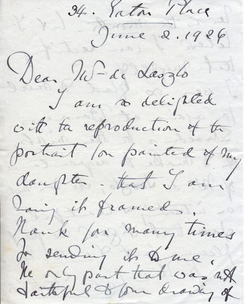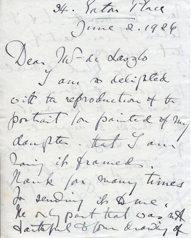 Letter from the Countess of Strathmore to de László expressing delight at reproduction of daughter's portrait [4460]. Only noticeable difference is mouth–plans to rectify herself. Glad to meet de László again at Baroness Schröder's