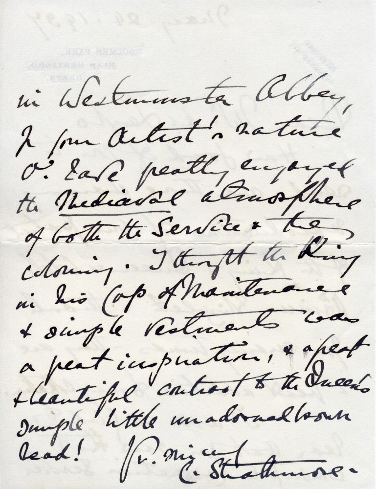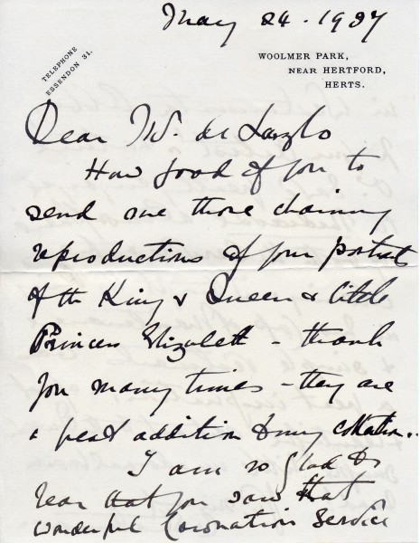 The Countess of Strathmore thanks de László for reproductions of King [9123], Queen [likely 9126] & Princess Elizabeth [10531]. Glad de László saw Coronation–mentions King and Queen's attire