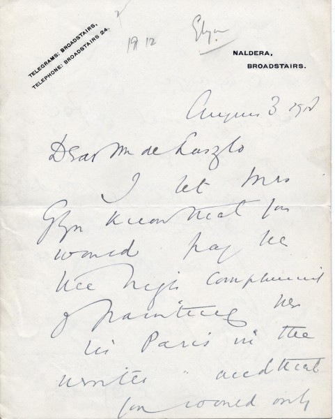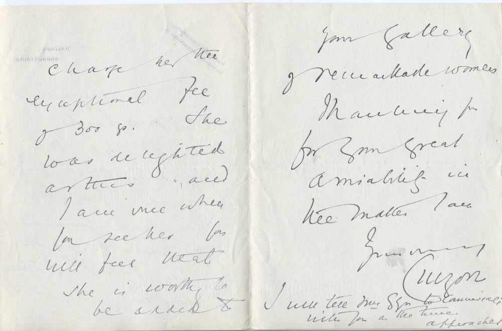 Letter from Lord Curzon to de László expressing Elinor Glyn's delight at de László's offer to paint her [5361] for the "exceptional fee of 300 gs" (see fn 1 in transcription re item's date) (duplicate item, see also DLA123-0004)