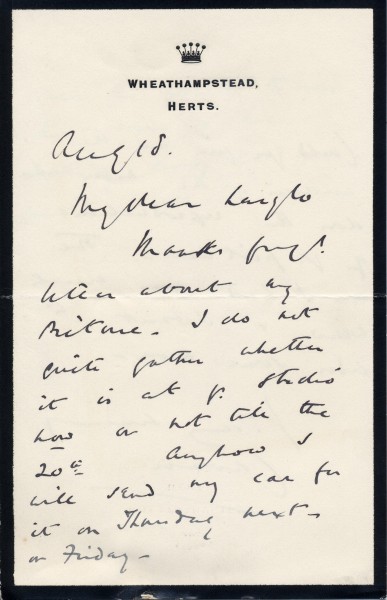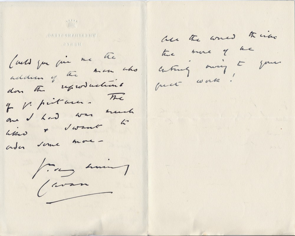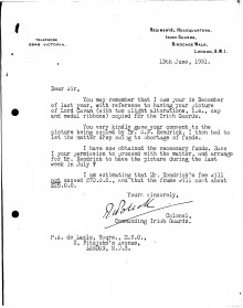 Letter from Lord Cavan to de László regarding collection of picture [4037]; wants more reproductions. "All the world think more of me certainly owing to your great work!", he writes (dated 18 Aug; possibly 1931, see fn 1 in transcription)