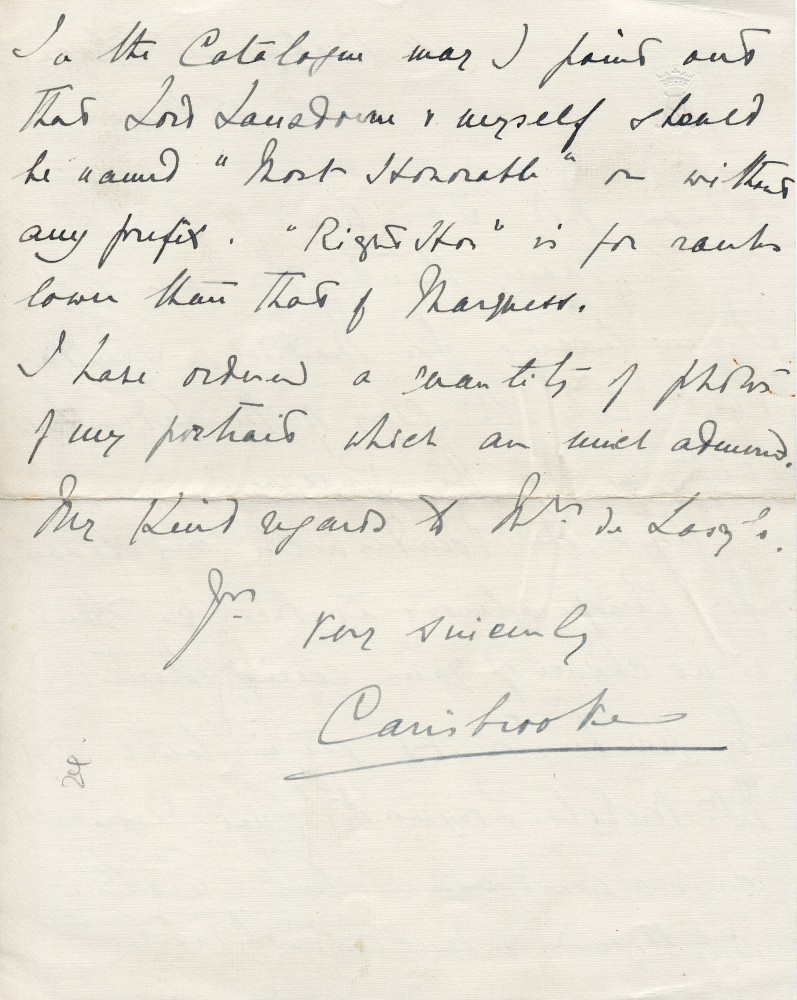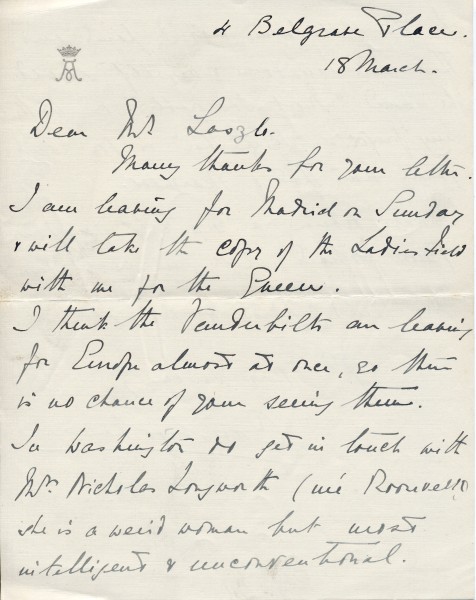 Lord Carisbrooke will bring "The Ladies' Field" to Madrid for Queen; advises de László to contact Mrs Longworth in Washington. Error in his & Lord Lansdowne's titles in exh catalogue; ordered photographs of portrait "which are much admired"