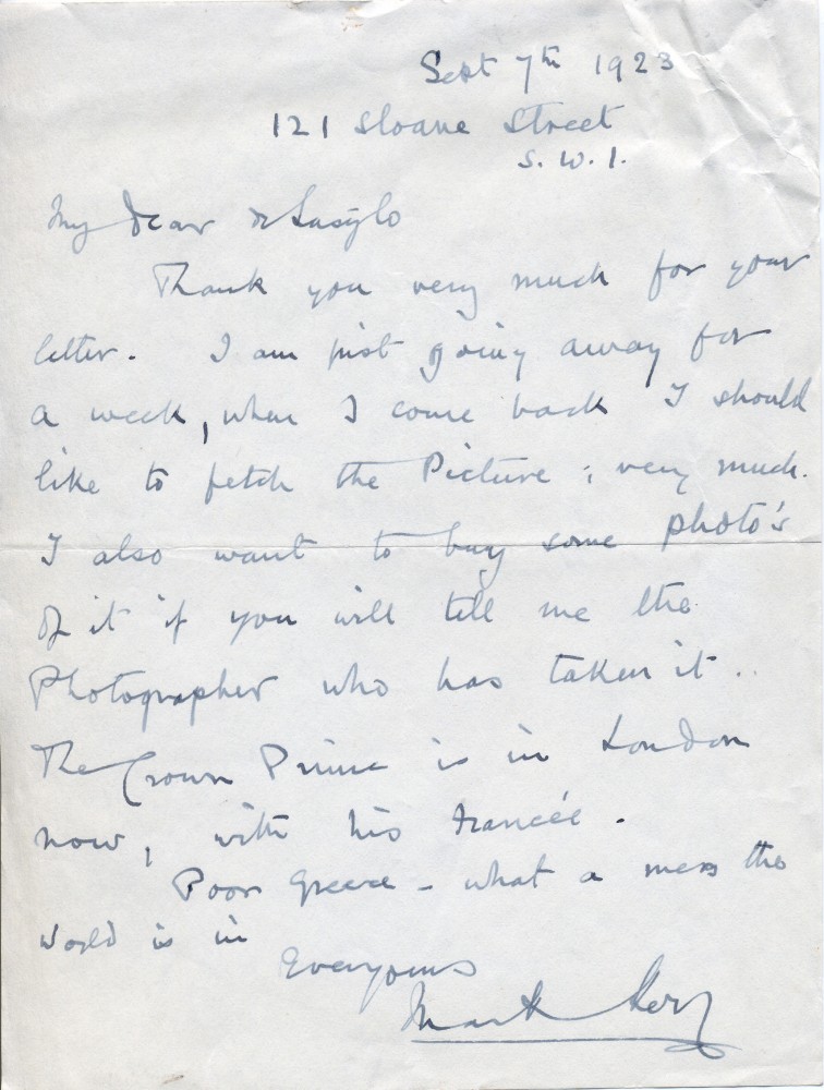 Admiral Mark Kerr wishes to collect picture [111822] from de László; would like photos. Refers to Swedish Crown Prince and fiancée's London visit; poor state of Greece