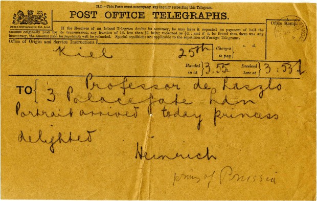 Telegram from Prince Heinrich of Prussia to de László confirming arrival of portrait [possibly 10183]