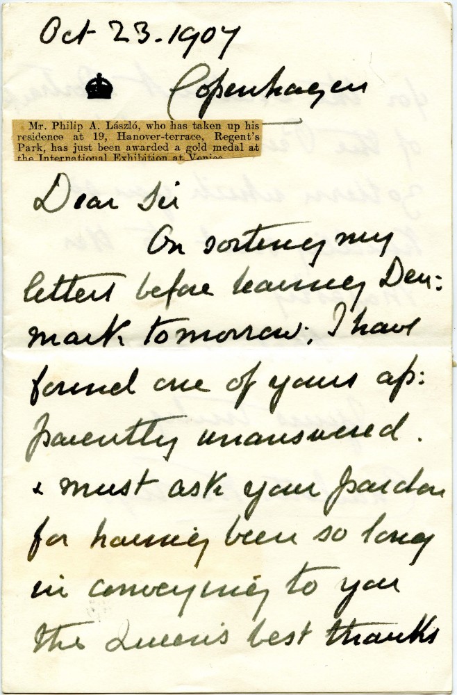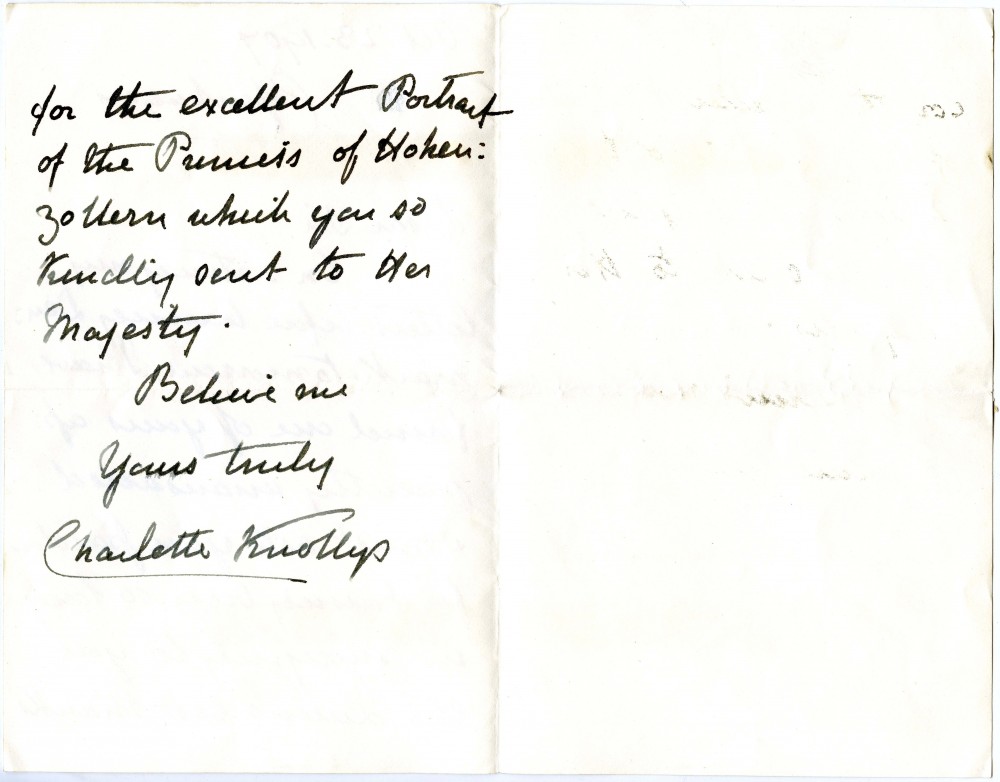 Charlotte Knollys thanks de László on behalf of Queen Alexandra for sending the Princess of Hohenzollern's portrait.