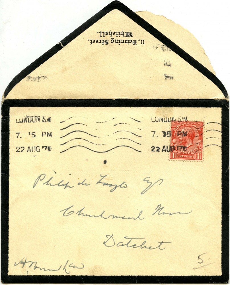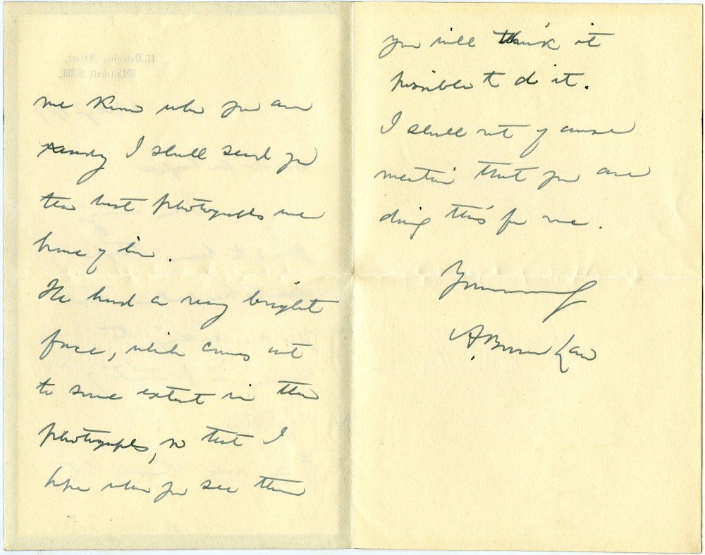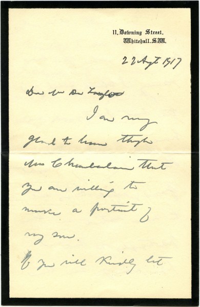 Letter from Bonar Law to de László expressing happiness that de László will paint posthumous portrait of his son (Charles); will send photographs