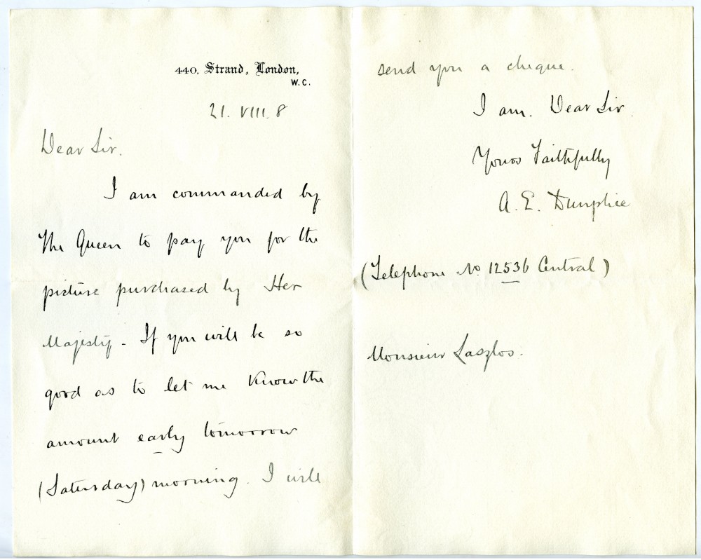 Letter from A.E. [Dunplice?] of Coutts bank to de László having been commanded by the Queen to pay for a picture