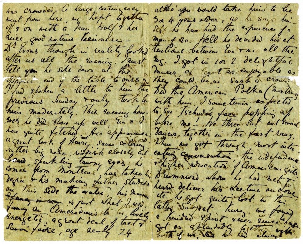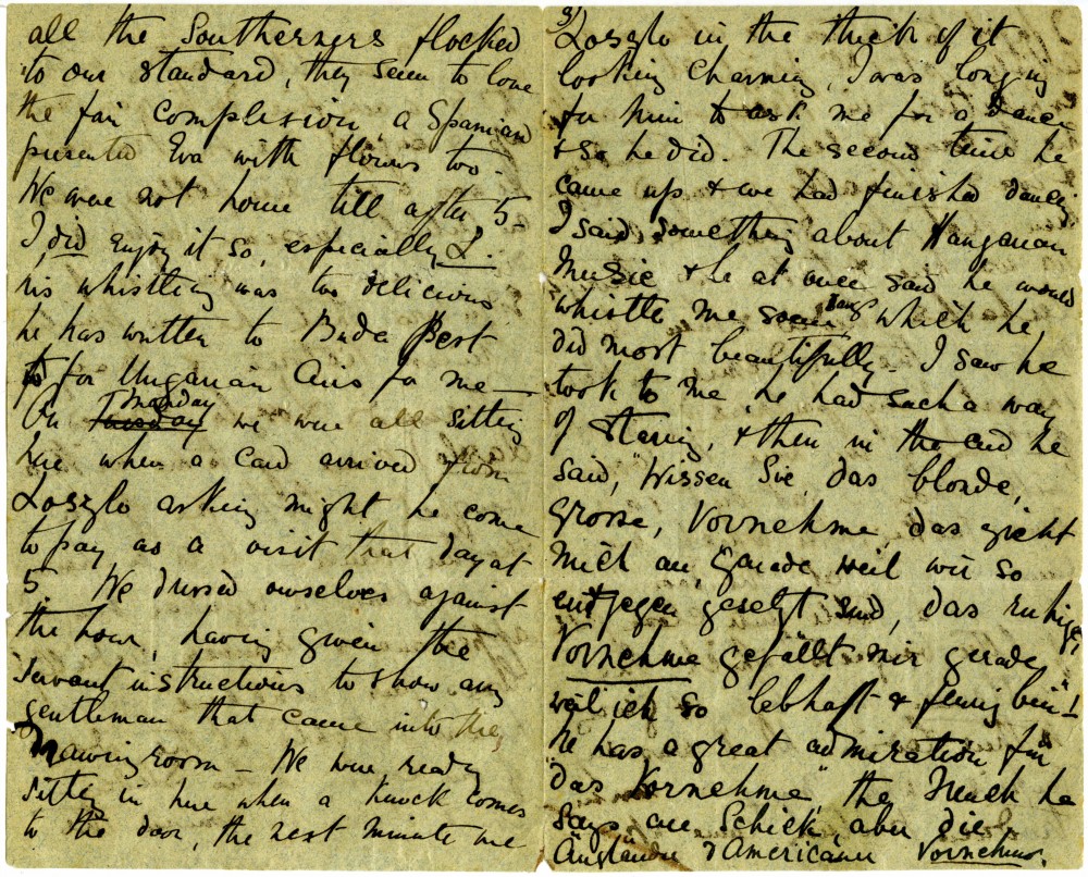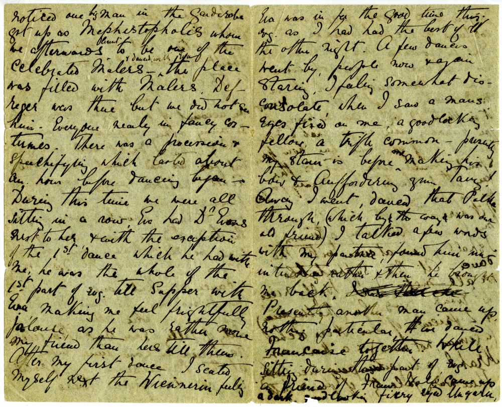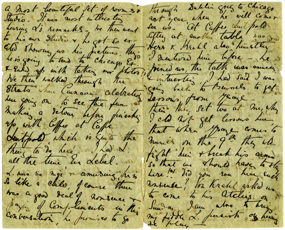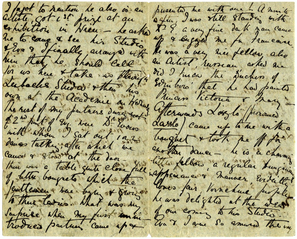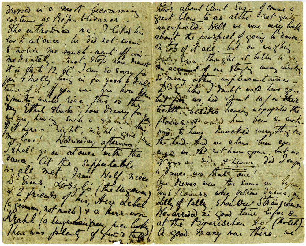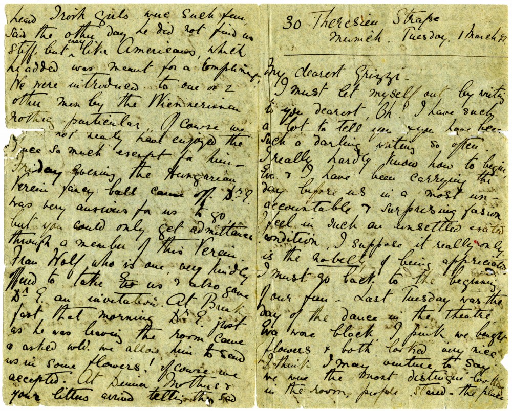 Letter from Lucy de László to Beatrice Grace Guinness describing her time with their sister Eva in Munich. Topics discussed: dances; balls; gowns; first time meeting de László & visiting studio (refers to de László's intended pictures for 1893 World’s Exhibition in Chicago); music lessons; travelling companions