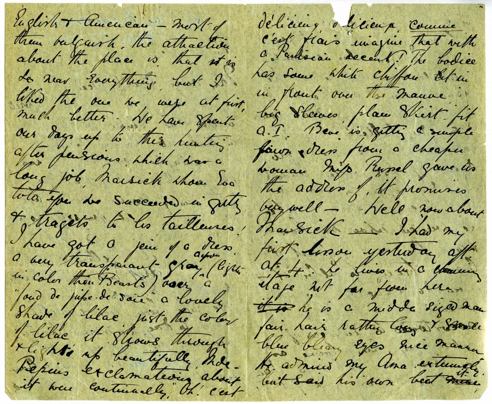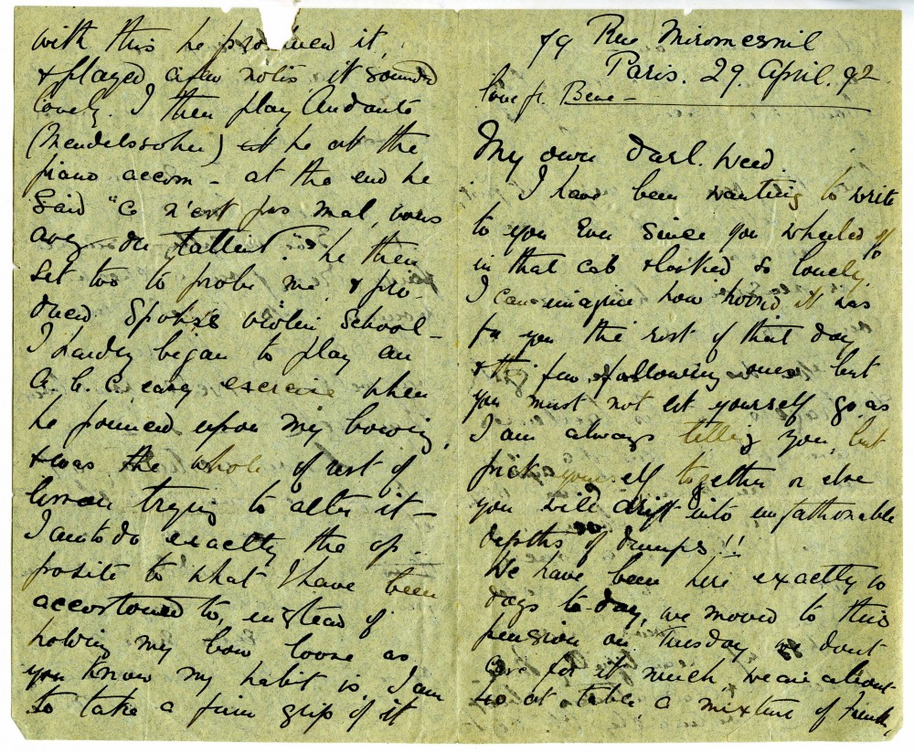 Letter from Lucy to "Weed" (possibly her sister Constance) whilst in Paris re: accommodation; dress shopping; violin lessons with Martin Pierre Marsick