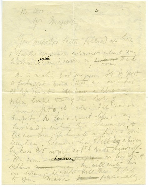 Draft letter from Lucy to the Queen of Romania: de László's health; Cap Ferrat; memoirs; transportation of portraits [possibly 3211 & 4220]; exhibition of Queen's portrait [possibly 3211]; death of Leresanu; abdication and proclamation Duke of York