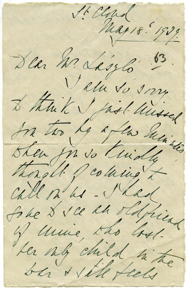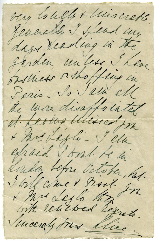 Letter from Princess Alice of Greece to de László expressing regret at missing de László & Lucy; travel plans