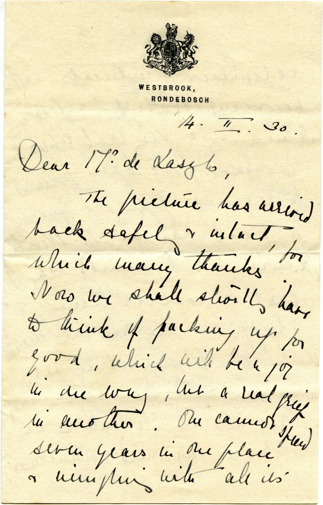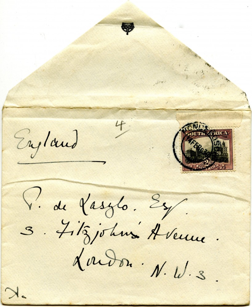 Letter from Princess Alice, Countess of Athlone to de László confirming portrait's return [2447]; her plans to leave Capetown; local artist Neville Lewis has painted their portraits for the Johannesburg Art Gallery
