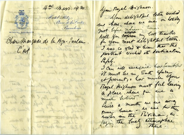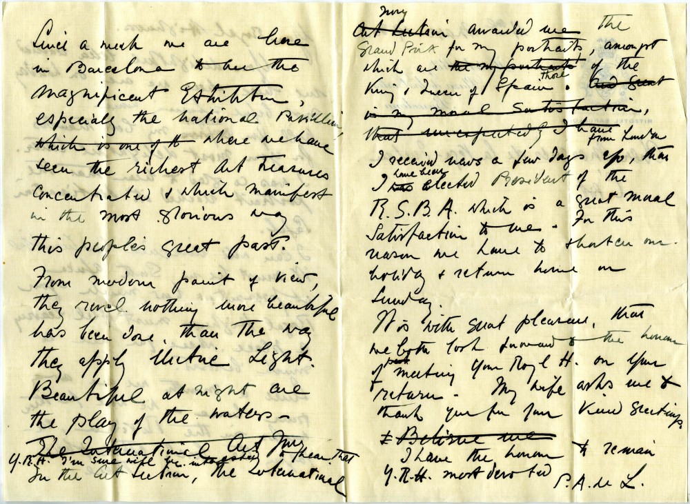 Draft letter from de László to Princess Alice, Countess of Athlone re: return of portrait [2447]; Barcelona's International Exposition; Grand Prix award for portraits of King & Queen of Spain; appointment as president of Royal Society of British Artists (first page includes dated draft salutation to Vega-Inclán)