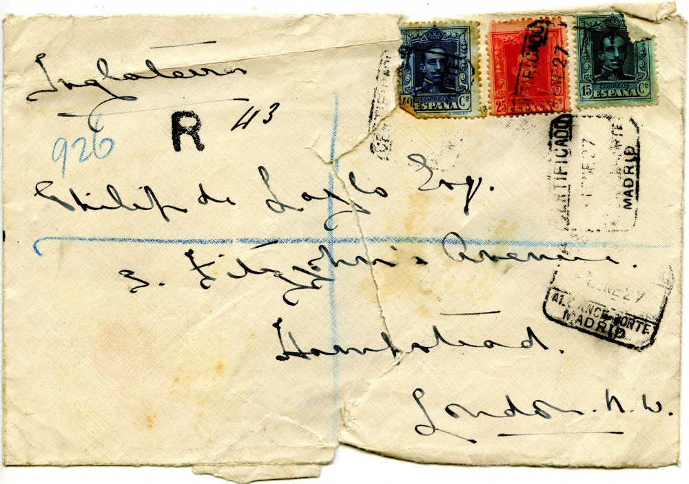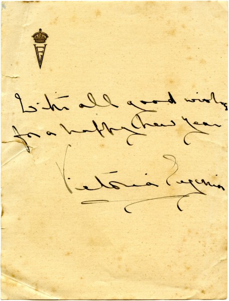 Queen Victoria Eugenia of Spain wishing de László a happy New Year (postmark on accompanying envelope possibly reads "[19]27")