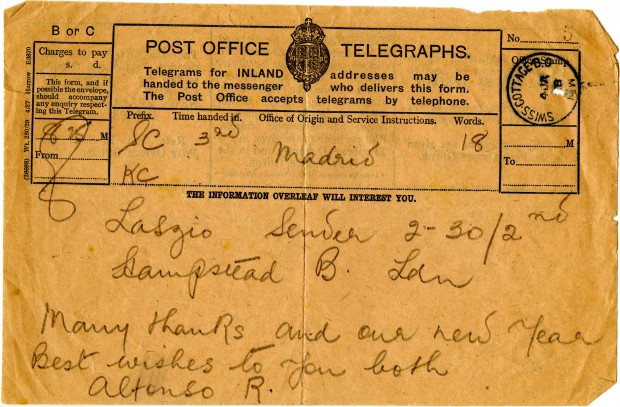 Telegram from King Alfonso XIII of Spain to de László with thanks and New Year wishes (illegible date)
