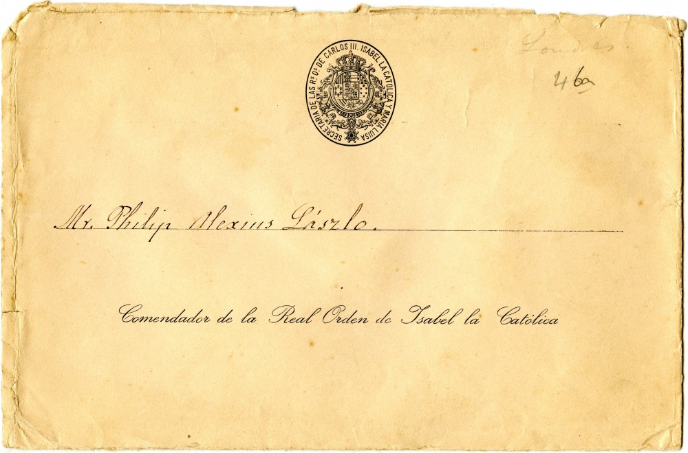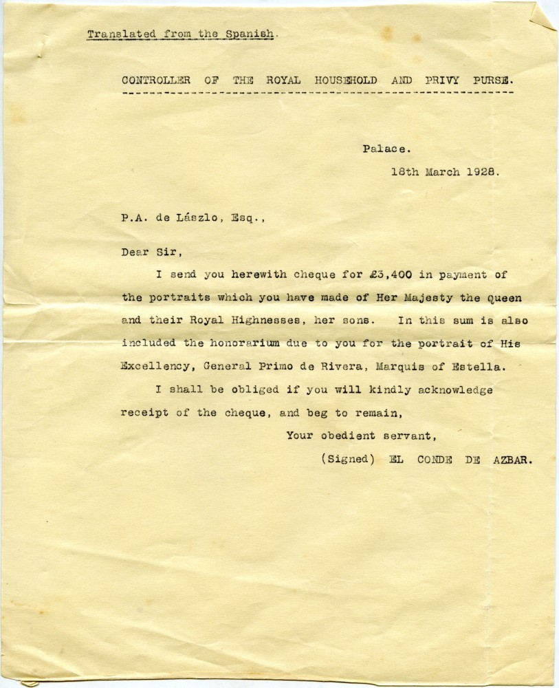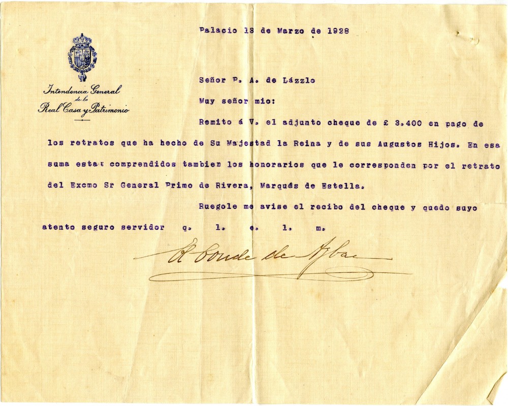 Letter from the conde de Aybar to de László regarding settlement of the honoraria for portraits of the Queen of Spain, her two sons and General Primo de Rivera [111272]